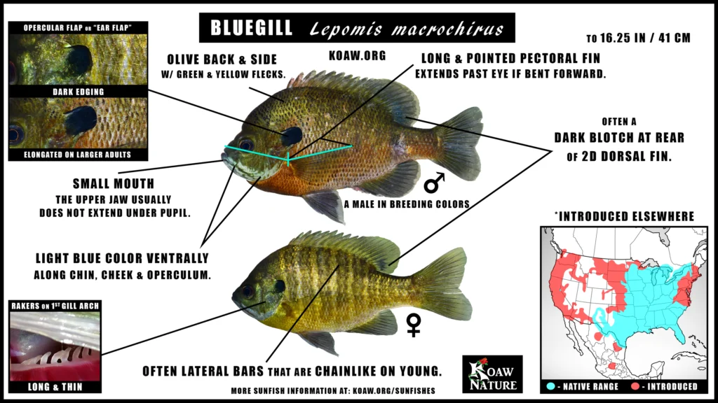 Hybrid Bluegill will also have fluorescent streaking around the mouth and less visible vertical bars like bluegill.